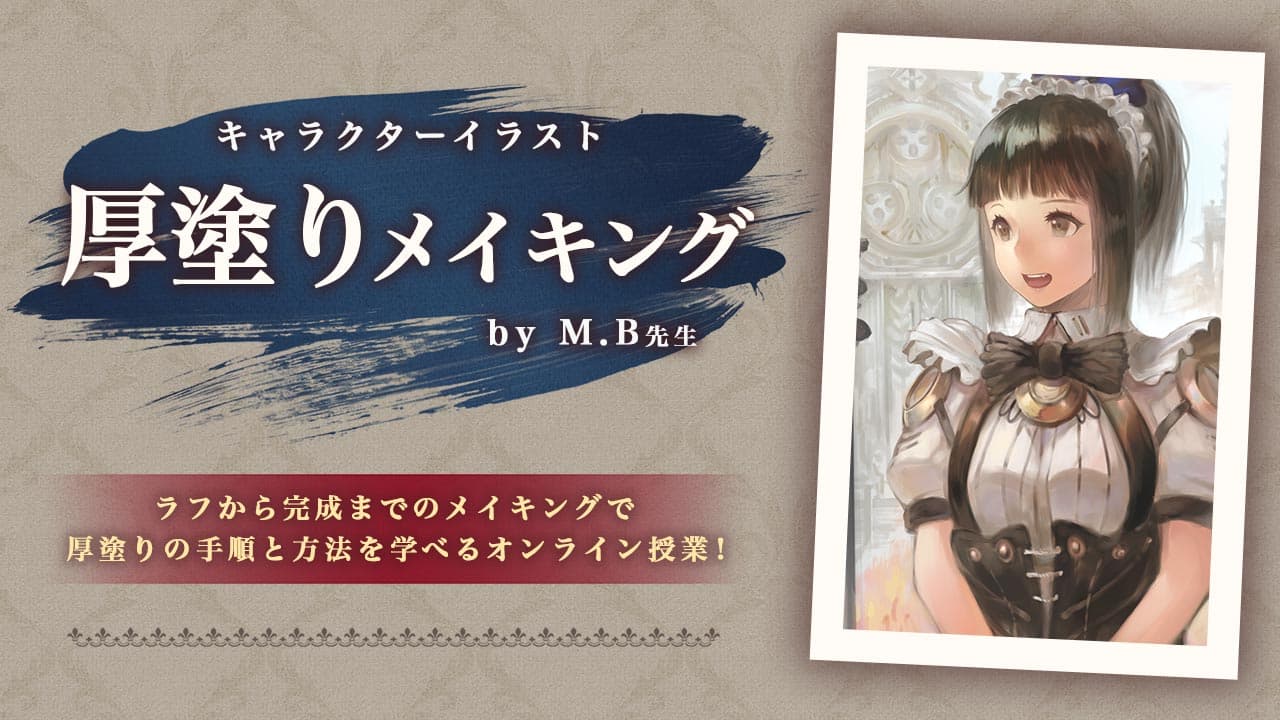 O Xrhsths お絵かき講座パルミー 液タブ Cpn中 Sto Twitter M B先生の厚塗り講座 タッチを残して色を塗り重ねる 厚塗り で1枚イラストを制作する過程を 全3回の授業を通したメイキングで解説します ロ ੭ 11 1 火 までの申込で受講料 Off
